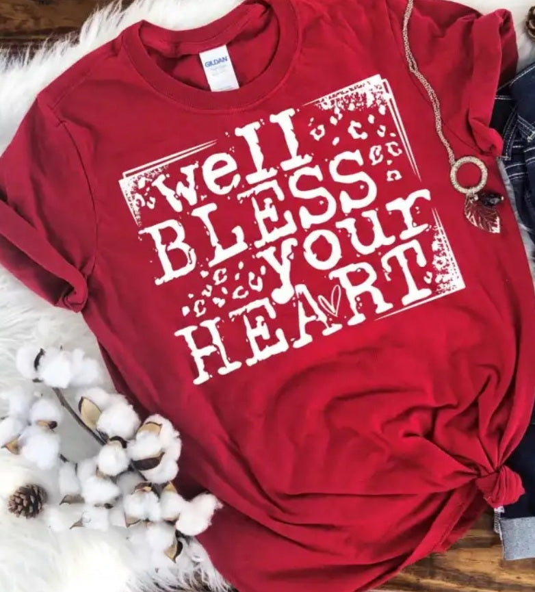 Bring sass to your wardrobe with this Bless Your Heart tshirt! Classic southern style meets modern design to give you a look that's sure to turn heads. Show off your southern pride and charm with this unique piece! Y'all won't want to miss out!