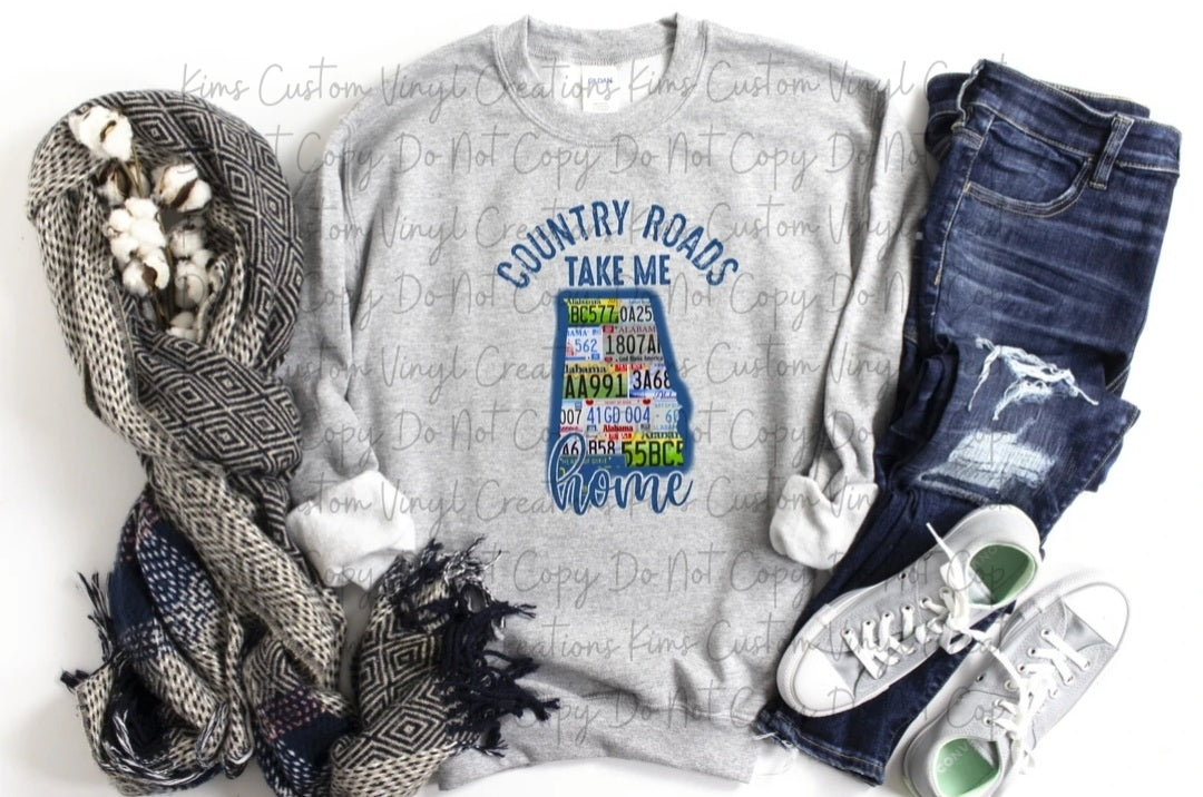 Show your Alabama pride with this Country Roads Take Me Home t-shirt. Made from quality materials, this shirt features bold, vibrant colors that will stand out in any crowd. Perfect for any fan, this t-shirt is designed to show off your state pride.